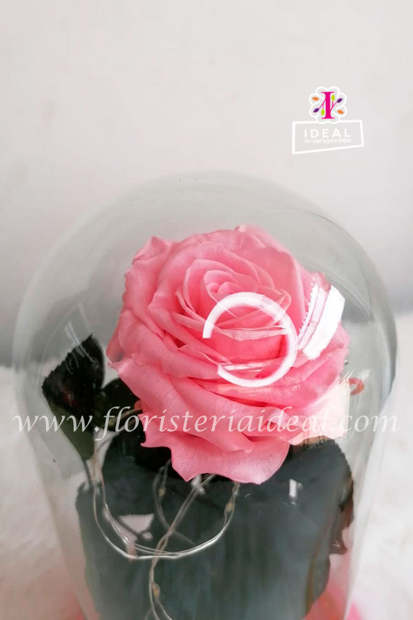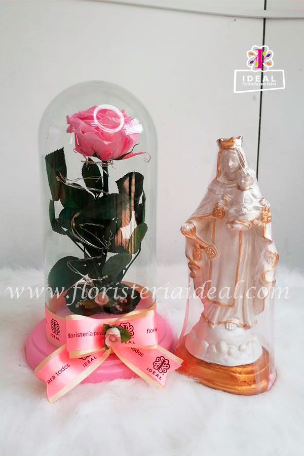 Hermosa y delicada rosa preservada de color rosa. incluye imagen de la virgen del Carmén y tarjeta para ocasión.