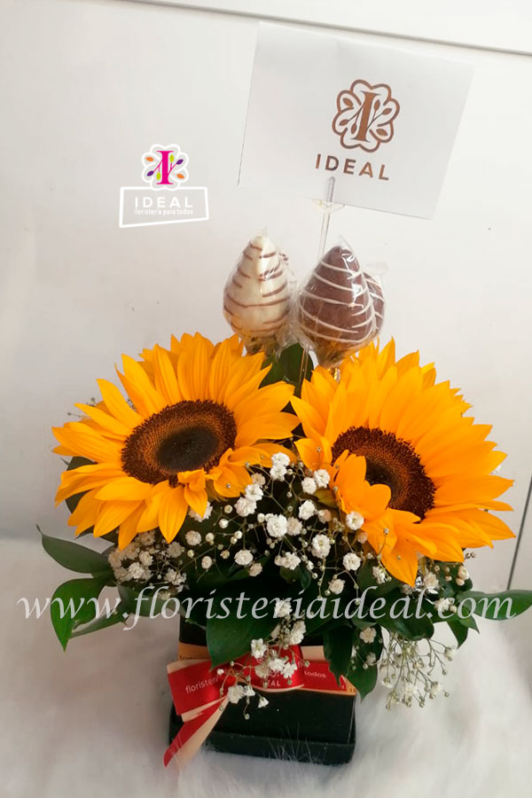 Hermoso arreglo floral elaborado en bellos Girasoles y acompañado de bellos follajes. Incluye 4 Chocofresas y tarjeta para ocasión.