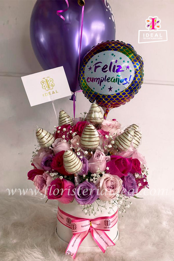 Hermoso y delicado arreglo floral elaborado en rosas, montado en caja circular y acompañado de deliciosas fresas con cubierta de chocolate. incluye tarjeta de ocasión y globos.