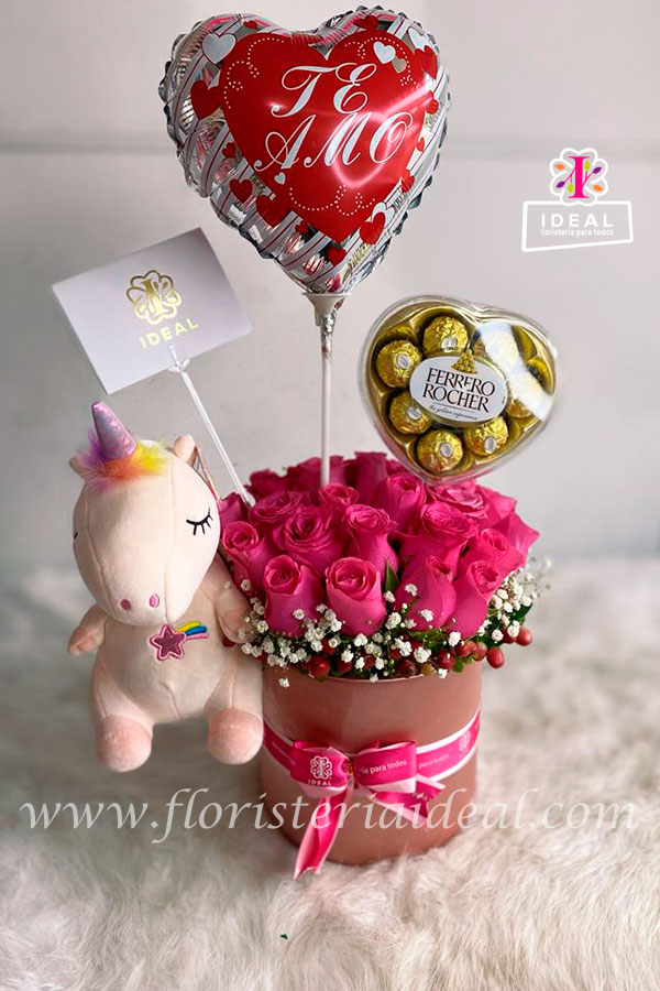Lindo arreglo floral elaborado en rosas rojas, acompañado de bellos follaje, chocolates, globos y peluche antialérgico. Incluye tarjeta para ocasión.