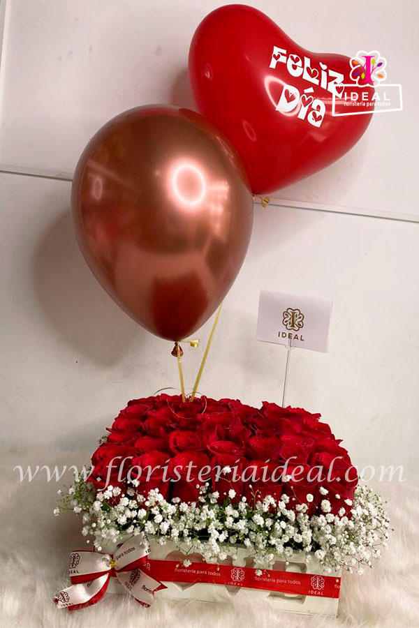 Hermoso y especial arreglo floral elaborado en bellas rosas rojas, acompañado de hermosos follajes y globos de helio. Incluye tarjeta para ocasión.