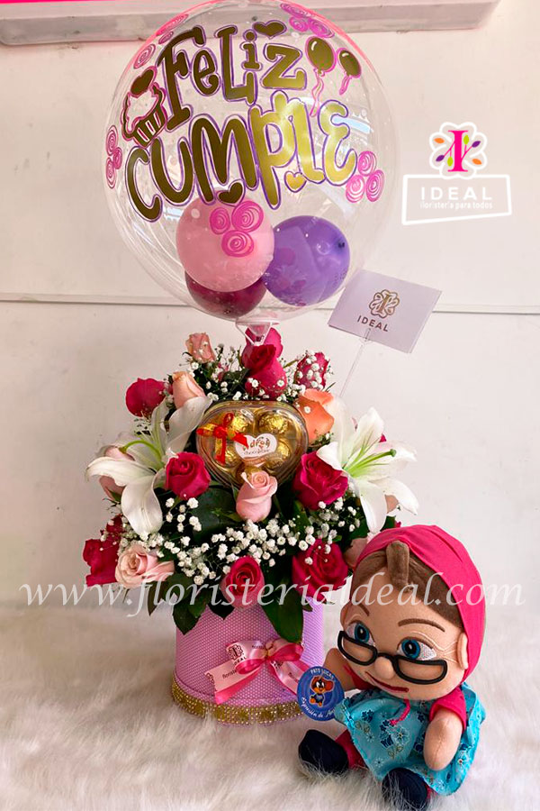 Lindo arreglo floral montado en caja circular, elaborado en rosas y lirios, acompañado de Globo sintético, chocolates y peluche. Incluye tarjeta para ocasión.