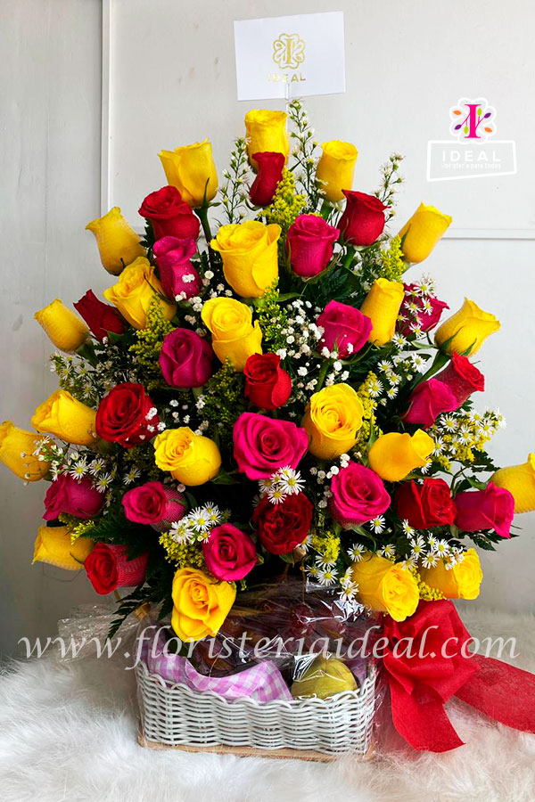 Delicado arreglo floral elaborado en bellas rosas y delicados follajes esta acompañado de frutas surtidas y tarjeta para la ocasión.