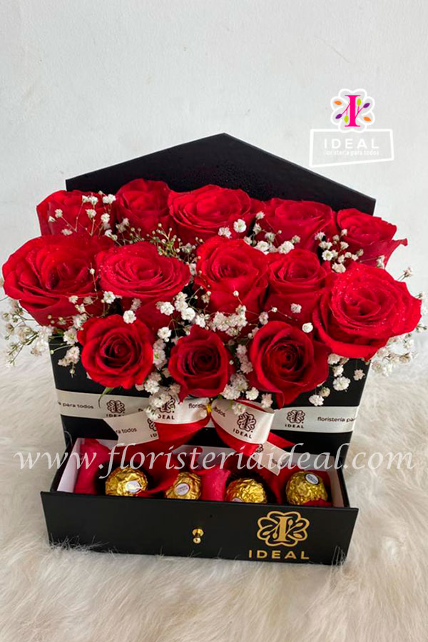 Lindo arreglo floral elaborado en bellas rosas y ricos chocolates su base es una linda caja edición limitada incluye tarjeta para la ocasión.