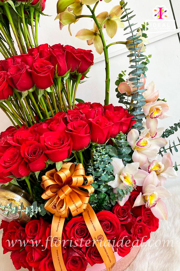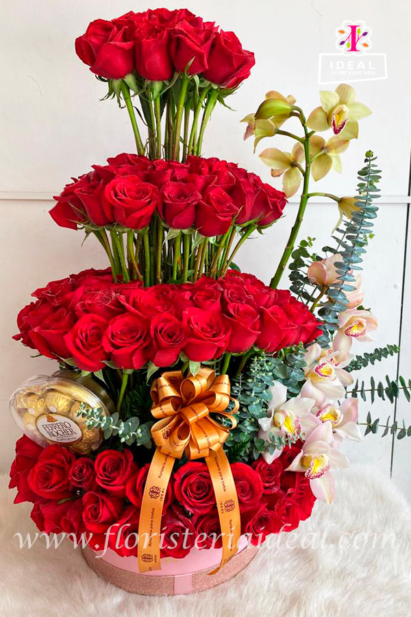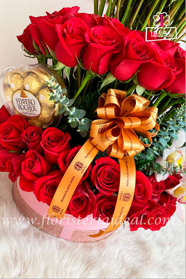 Hermoso ramo floral de rosas , cinvidios y demás follajes, acompañado de linda presentación , deliciosos chocolates Ferrero Rocher y tarjeta con mensaje deseado para la ocasión.