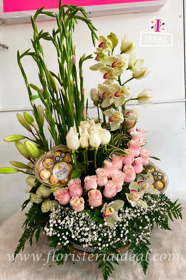 Hermoso ramo floral especial de rosas, orquídeas, gladiolos, lirios y demás follajes acompañado de chocolates Ferrero Rocher y respectiva tarjeta con mensaje deseado para la ocasión .