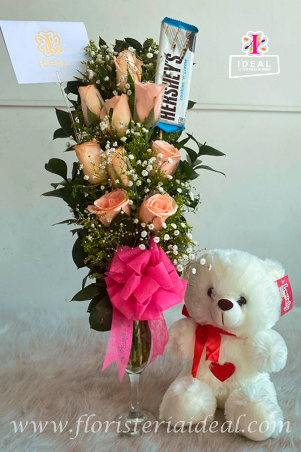 Hermoso solitario en base de vidrio y lindas rosas con follajes ,moño decorativo ,chocolatina y tierno peluche y tarjeta con mensaje deseado para la ocasión .