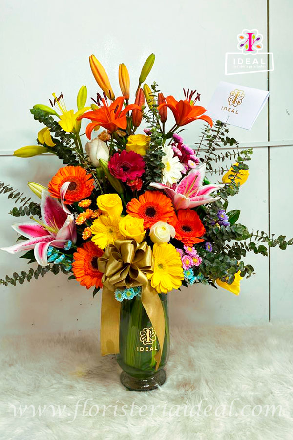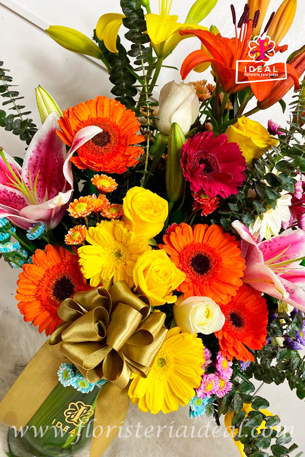 Delicado arreglo floral elaborado en lirios, gerberas ,rosas y demás follajes moño decorativo acompañado de una linda tarjeta con mensaje deseado para la ocasión.