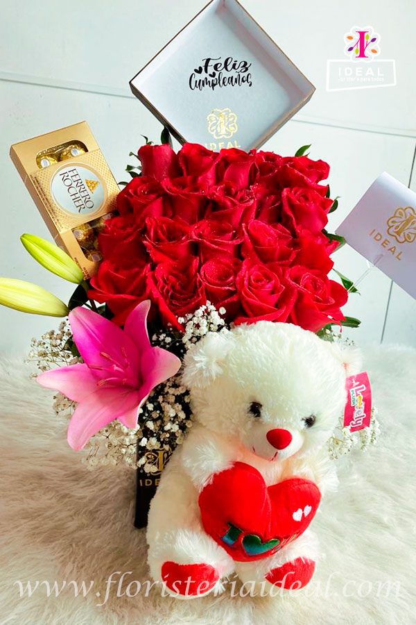 Delicada caja floral con rosas acompañado de tierno peluche, con cofre de chocolates ferrero rocher y su respectiva tarjeta con mensaje deseado para la ocasión.