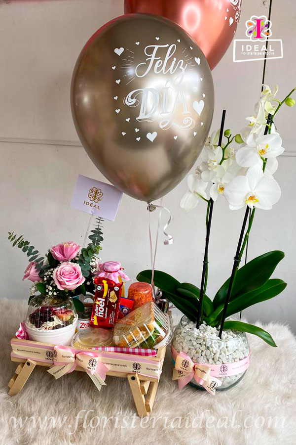 Hermosa planta de orquídea y globos en helio con tarjeta para la ocasión.