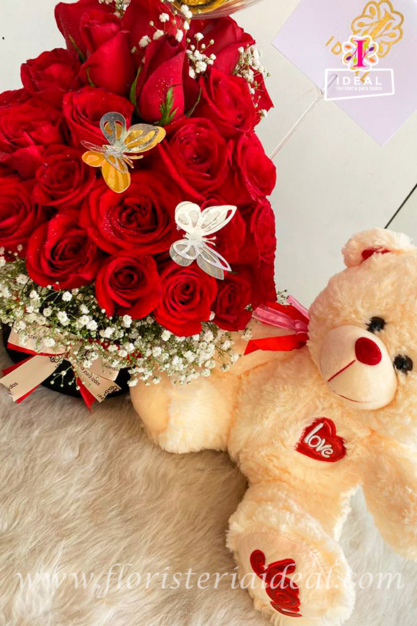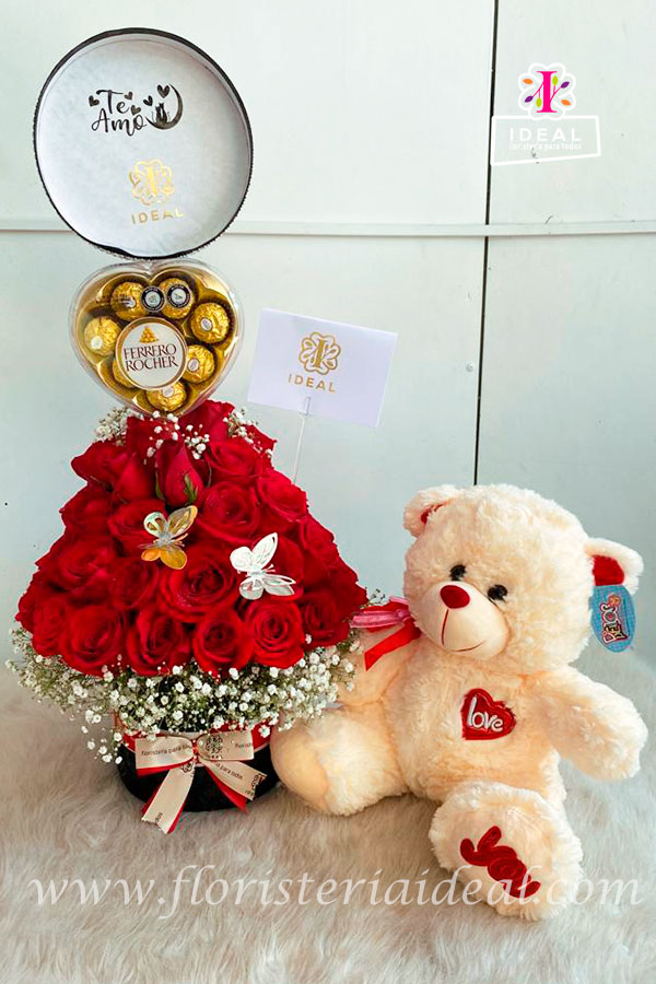 Delicado ramo floral redondo elaborado en bellas rosas y demás follajes ,deliciosos chocolates Ferreros Rocher acompañado de tierno peluche , y su respectiva tarjeta con mensaje deseado.