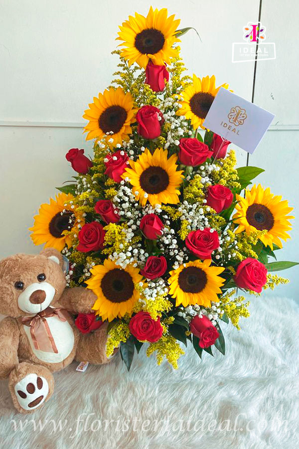 Hermoso ramo floral lindas rosas y girasoles con follajes acompañado de tierno peluche y tarjeta con mensaje deseado para la ocasión .