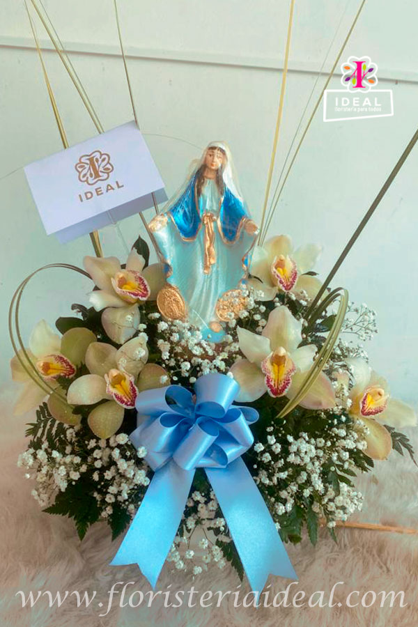 Hermoso arreglo floral de condolencias , elaborado con sinbidios ,follajes e imagen de la virgen además de envase de vidrio , moño decorativo y tarjeta con mensaje deseado .