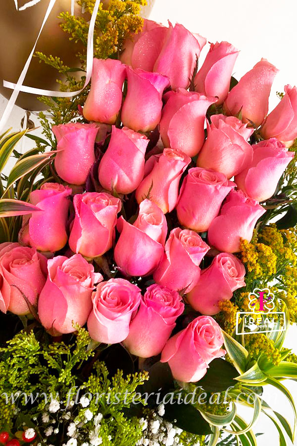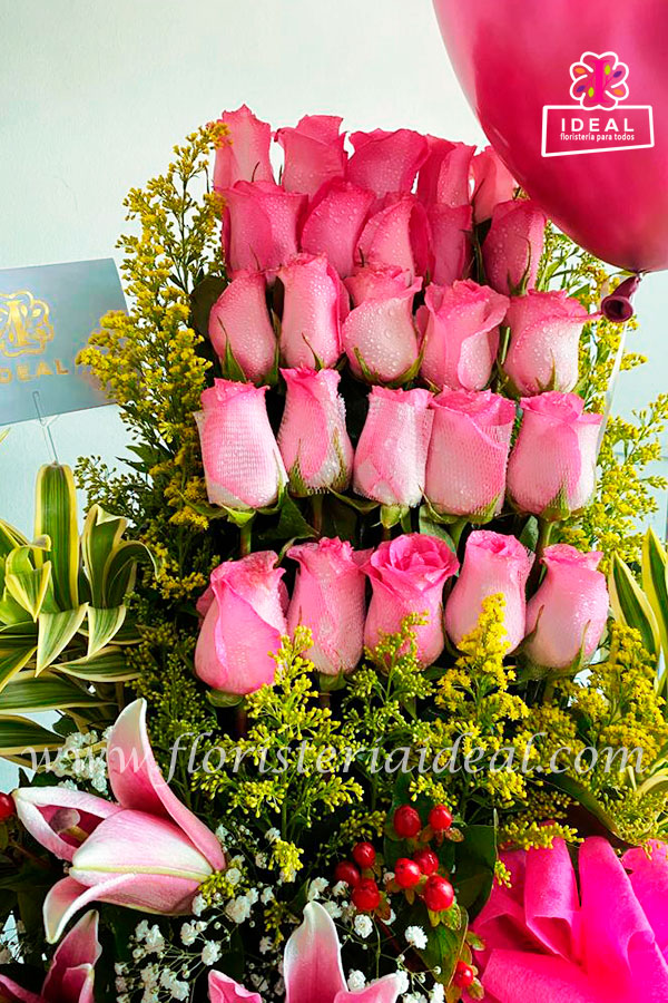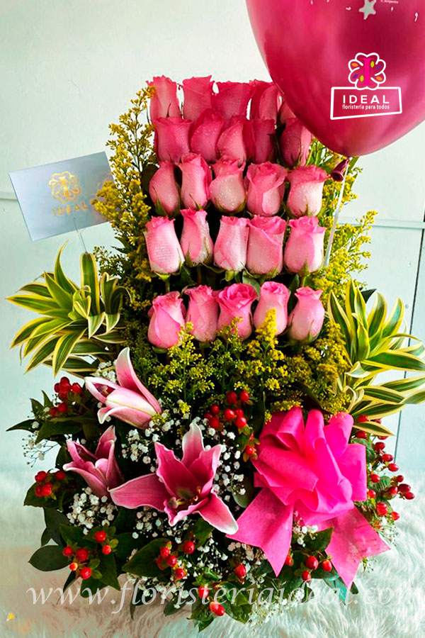 Delicado arreglo floral elaborado con delicadas rosas acompañado de lindo lirios y bellos follajes,