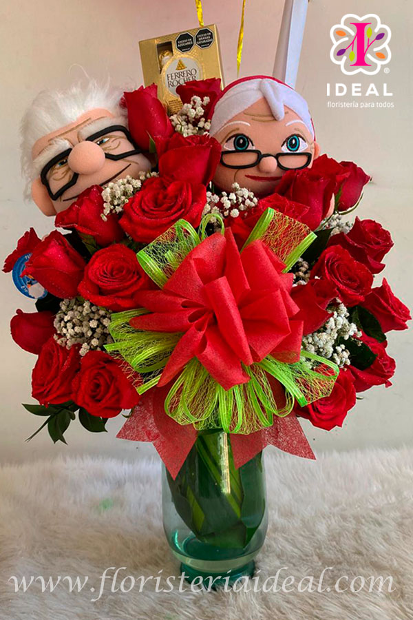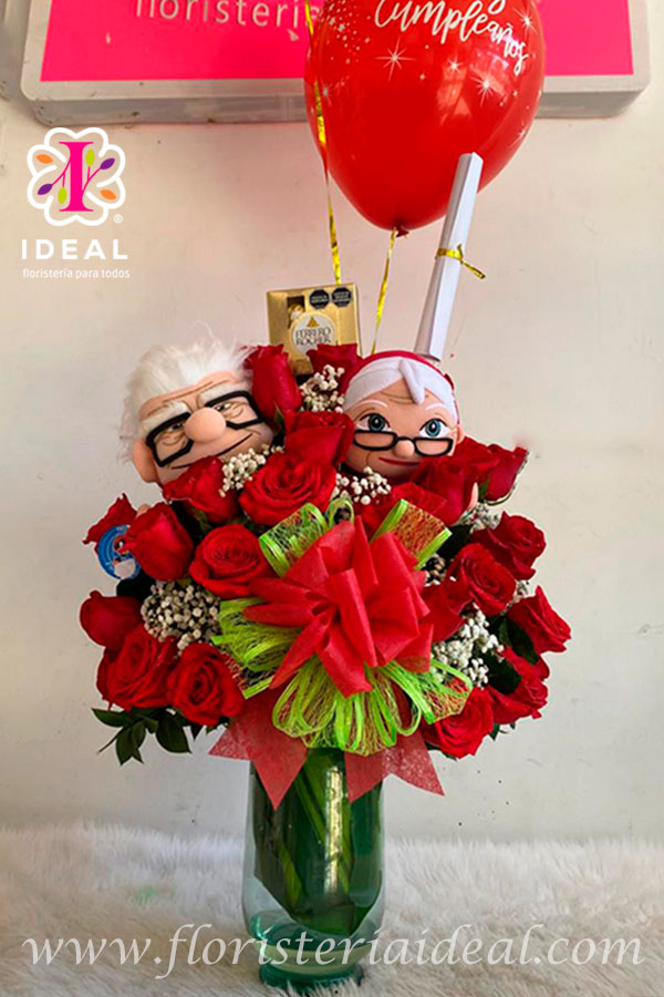 Hermoso arreglo floral de una sola cara, con hermosos peluches y deliciosos chocolates, con globos y tarjeta personalizada.