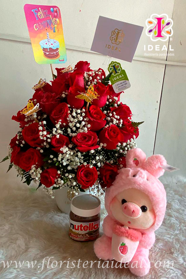 Hermoso ramo elaborado en rosas rojas con tierno y Nutella mas tarjeta para la ocasión