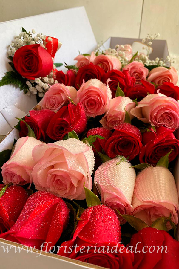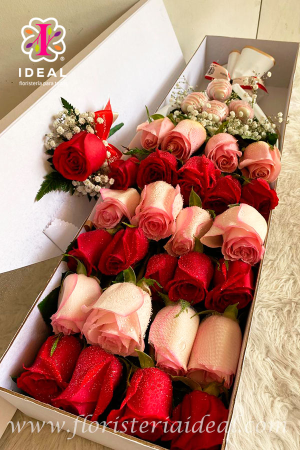Hermosa caja alargada con deliciosas chocofresas y tarjeta personalizada