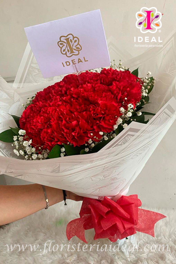 Hermoso bouquet de claveles rojos, con linda tarjeta para la ocasion.