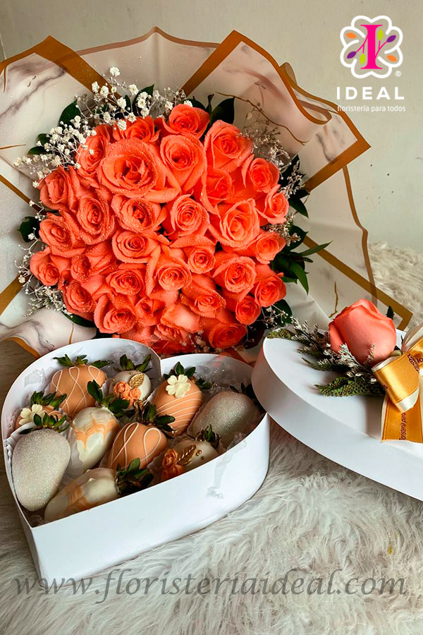 Hermoso bouquet de rosas de lindos colores acompañados de deliciosa caja de fresas y tarjeta para la ocasión