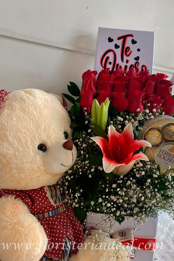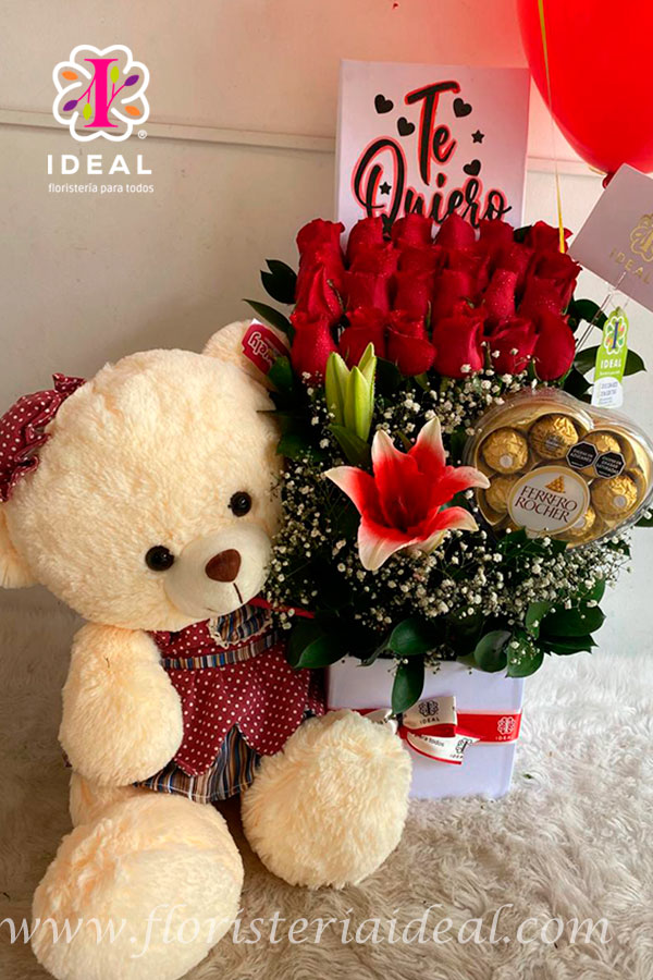 Hermosa caja cuadrada elaborada en rosa roja acompañada de deliciosos chocolates Ferrero en forma de corazón y tierno peluche de oso. con globos en helio, mas tarjeta personalizada