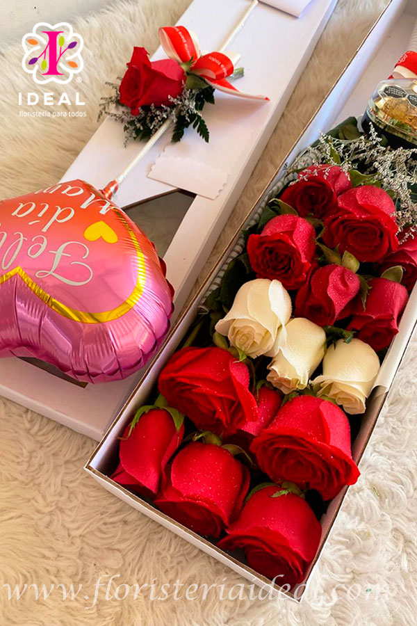 Hermosa caja alargada elaborada en lindas rosas rojas y blancas, acompañadas de lindo globo y chocolates adro de 5 unidades, mas tarjeta personalizada para la ocasión.