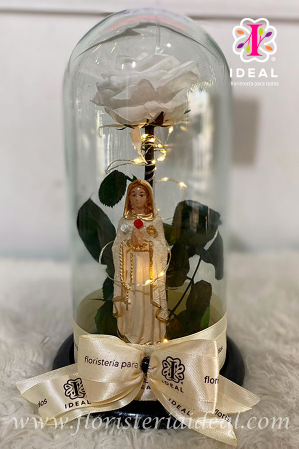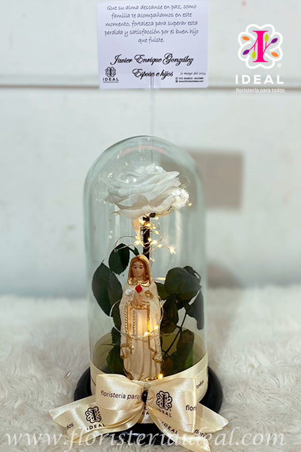 HERMOSA ROSA PRESERVADA, ACOMPAÑADA DE LINDA VIRGEN. CON TARJETA PERSONALIZADA Y LUZ LED