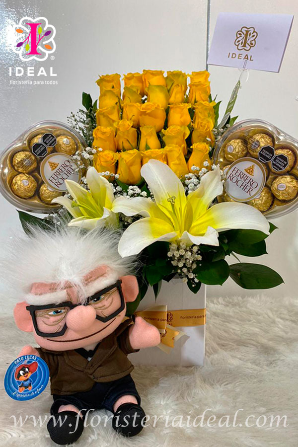 Hermosa caja cuadrada elaborada en lindas rosas amarillas, con dos cajas de deliciosos ferreros de corazón y lindo abuelito de peluche, con tarjeta personalizada.