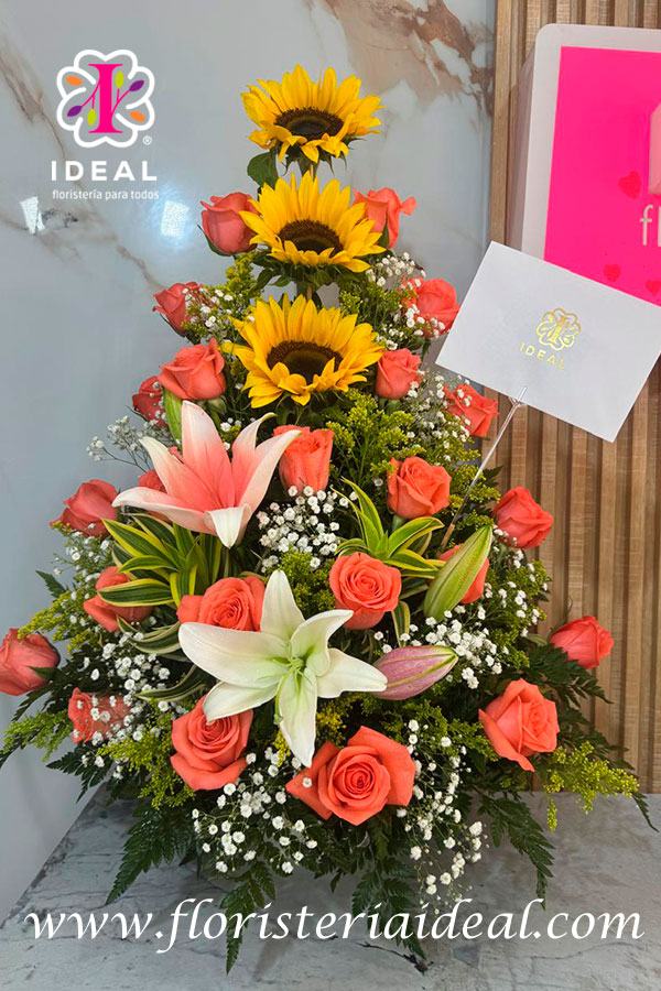 hermoso e espectacular ramo elaborado en roja salmon (opcional) y girasoles, con lirios
