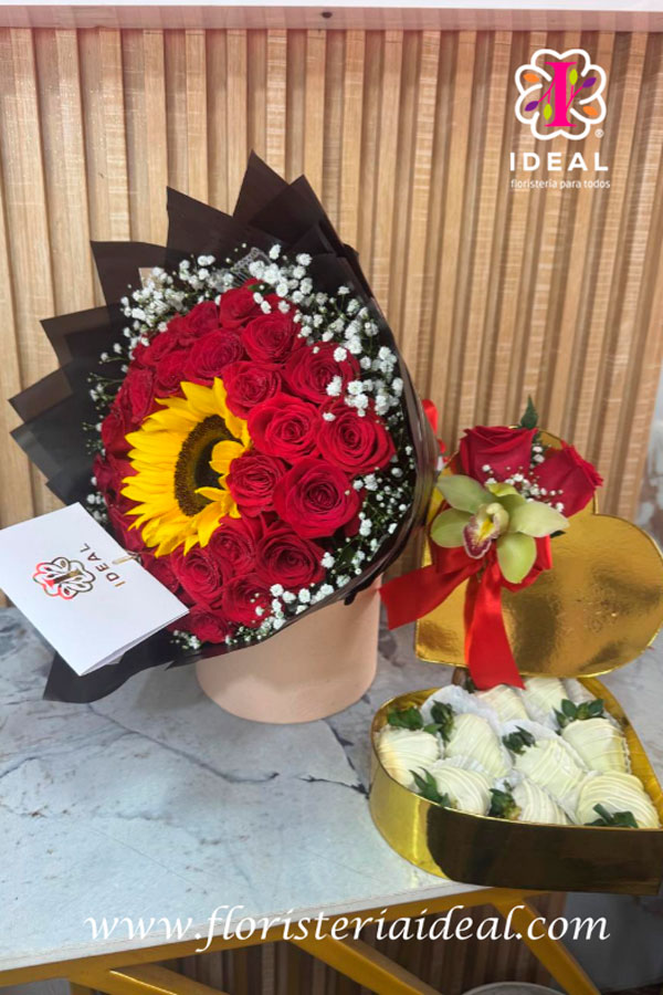 espectacular arreglo floral en rosa roja con un girasol en el medio acompañado de unas espectacular fresas