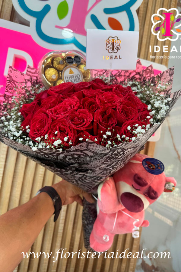 Peluches con flores y chocolates