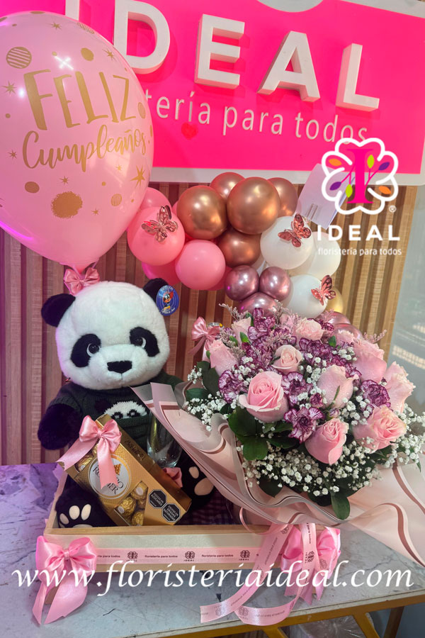hermoso y delicado arreglo floral acompañado de un hermoso peluche un arco en globos, chocolates ferrero, una champang rosada, una copa