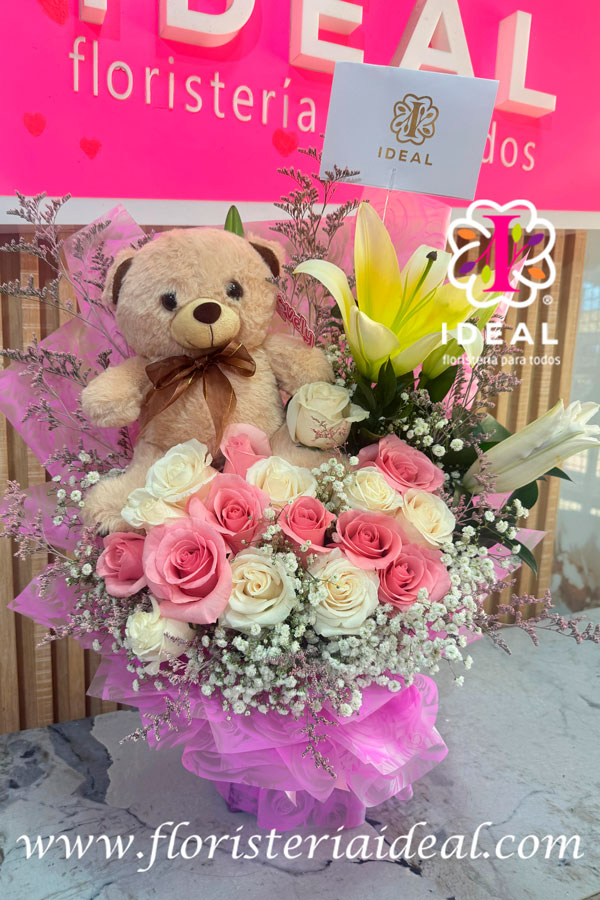 oso amoroso acompañado de unas hermosas rosas tonos pasteles