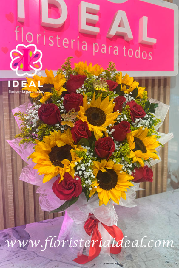 girasoles y rosas en su mayor esplandor, arreglo floral elaborado en rosas rojas y girasoles