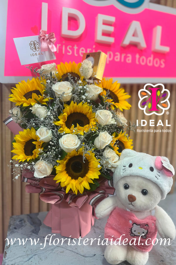 hermoso arreglo floral de girasoles acompañado de un hermoso panda disfrazad de hello kity