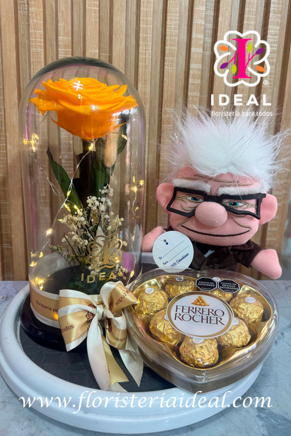 hermosa rosa preservada acompañada de un hemroso abuelo y chocolates