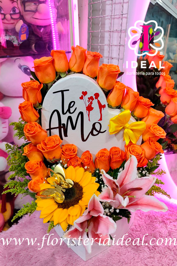 hermoso corazon en rosas y un girasol y dos lirios perfecto para regalar