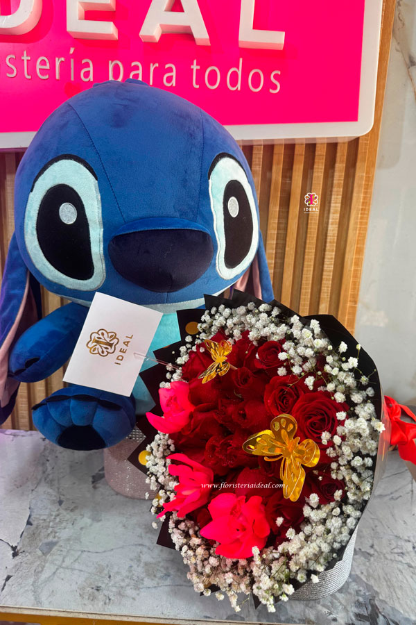 hermoso arreglo floral en rosa roja acompañado de un delicado stich