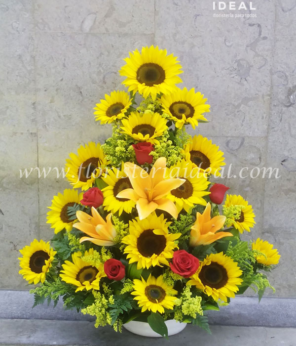 bello arreglo floral especial para un lindo cumplemeses elaborado con hermosos girasoles lirios y rosas acompañado de tierna tarjeta con mensajito para la ocasion.