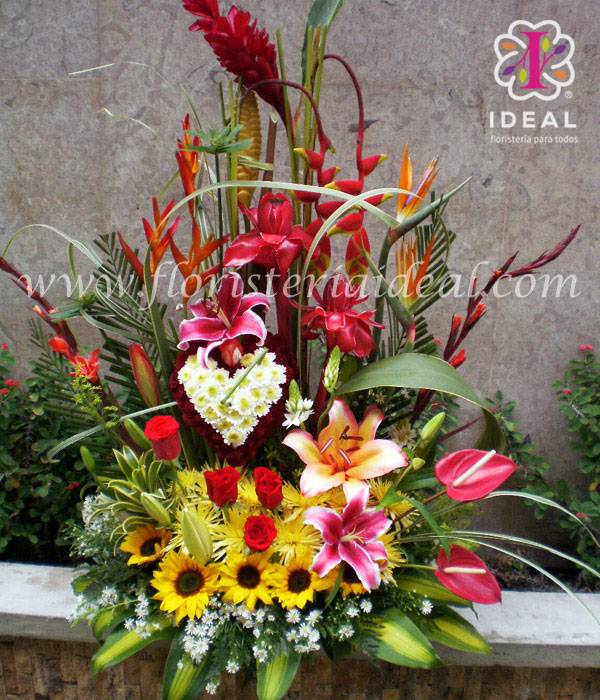 Obtén el perdón que tanto necesitas con este hermoso arreglo exótico con surco en girasoles, topiario aéreo de coquetas en forma de corazón y variedad de flores silvestres.
