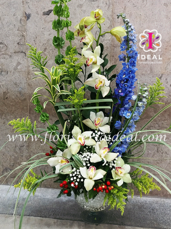 Especial arreglo de flores elaborado con lindas orquideas y tiernos follajes su base es una copa de vidrio y lo acompaña una tarjeta para la ocasión.