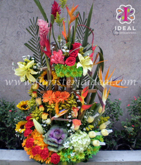 Expresa tus mas sinceros deseos por la salud de alguien querido, regala este hermoso arreglo multicolor de doble sección decorado con variedad de flores exóticas