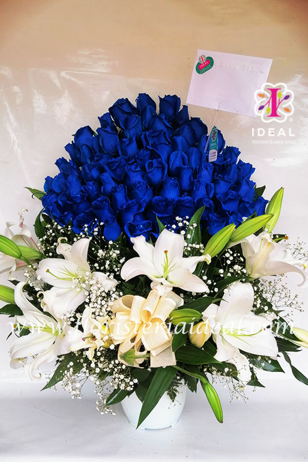Especial arreglo floral elaborado el delicadas rosas azules acompañadas de bellos lirios blancos + delicados follajes incluye tarjeta para la ocasión.