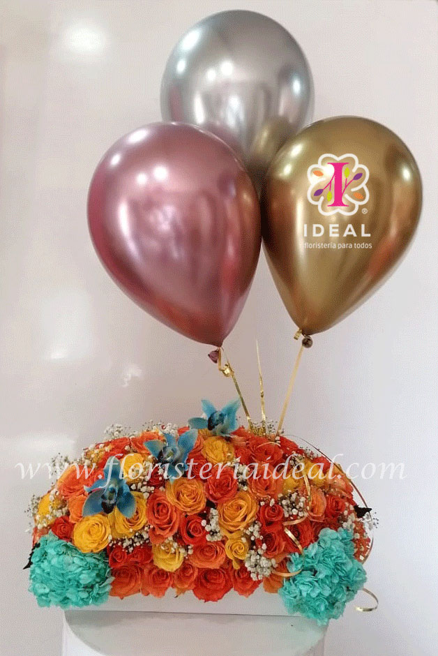 Linda jardinera elaborada en Rosas, Orquideas y Hortencias, incluye 3 globos en helio y tarjeta para la ocasión Cantidad de Rosas: 100