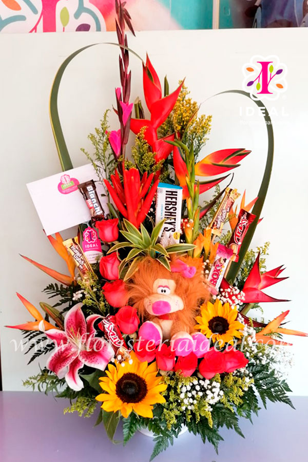 Sorprendente arreglo exótico elaborado con variedad de flores tropicales acompañado de chocolates y peluche de león.