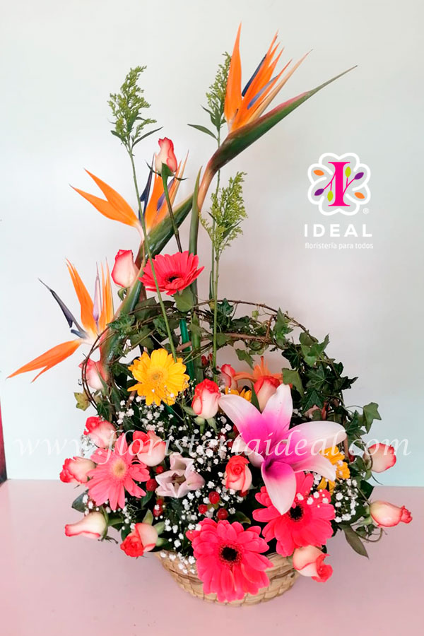Delicada canasta exótica elaborada en variedad de flores tropicales acompañado de tarjeta para la ocasión.