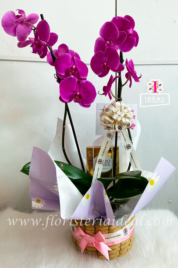 Delicada planta de orquídea decorada con base tipo canasto incluye deliciosos chocolates Ferrero Rocher y tarjeta con mensaje deseado para la ocasión.