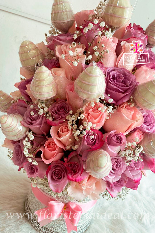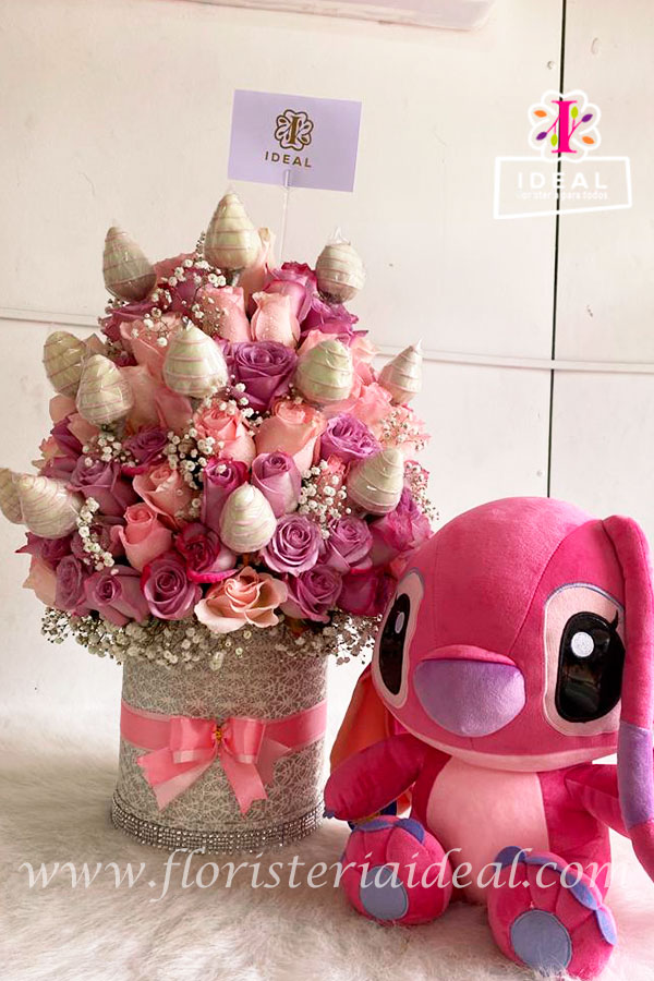 Delicado y hermoso arreglo floral en forma redonda (grande) elaborado en bellas rosas acompañado de tierno peluche , y su respectiva tarjeta con mensaje deseado.