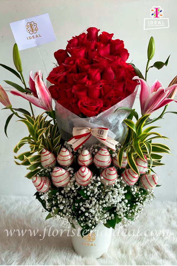 Lindo ramo floral en rosas hermosas acompañado de fresas cubiertas de chocolate y tarjeta con mensaje deseado para la ocasión.