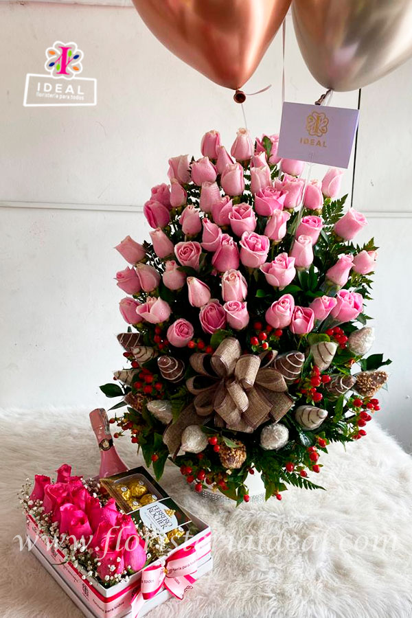 Hermoso ramo floral de una cara elaborado en bellas rosas y demás follajes acompañado de caja con fresas cubiertas de chocolate y botella de jp chenet con un toque de rosas en tipo jardín y tarjeta con su respectiva tarjeta con mensaje deseado para la ocasión .