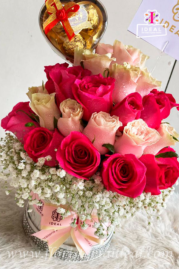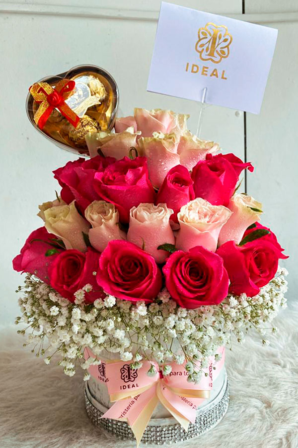 Arreglo floral redondo elaborado en rosas ,en caja tipo cuerina ,acompañado de deliciosos bombones y tarjeta para la ocasión con mensaje deseado.